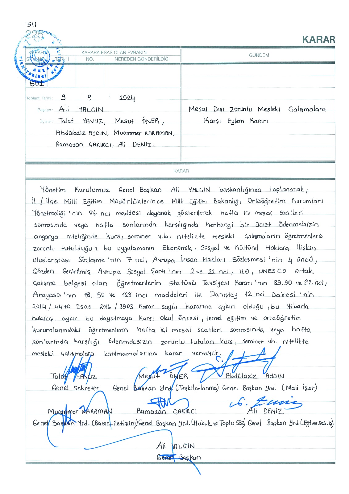 Eğitim çalışanlarının yaşadığı bu dört soruna işaret etmek ve çözümünü sağlamak maksadıyla sürdürdüğümüz eylemlerimize yeni eğitim yılında da devam ettiğimize dair aldığımız kararların resmî belgeleri kamuoyu ile paylaşılmıştır.