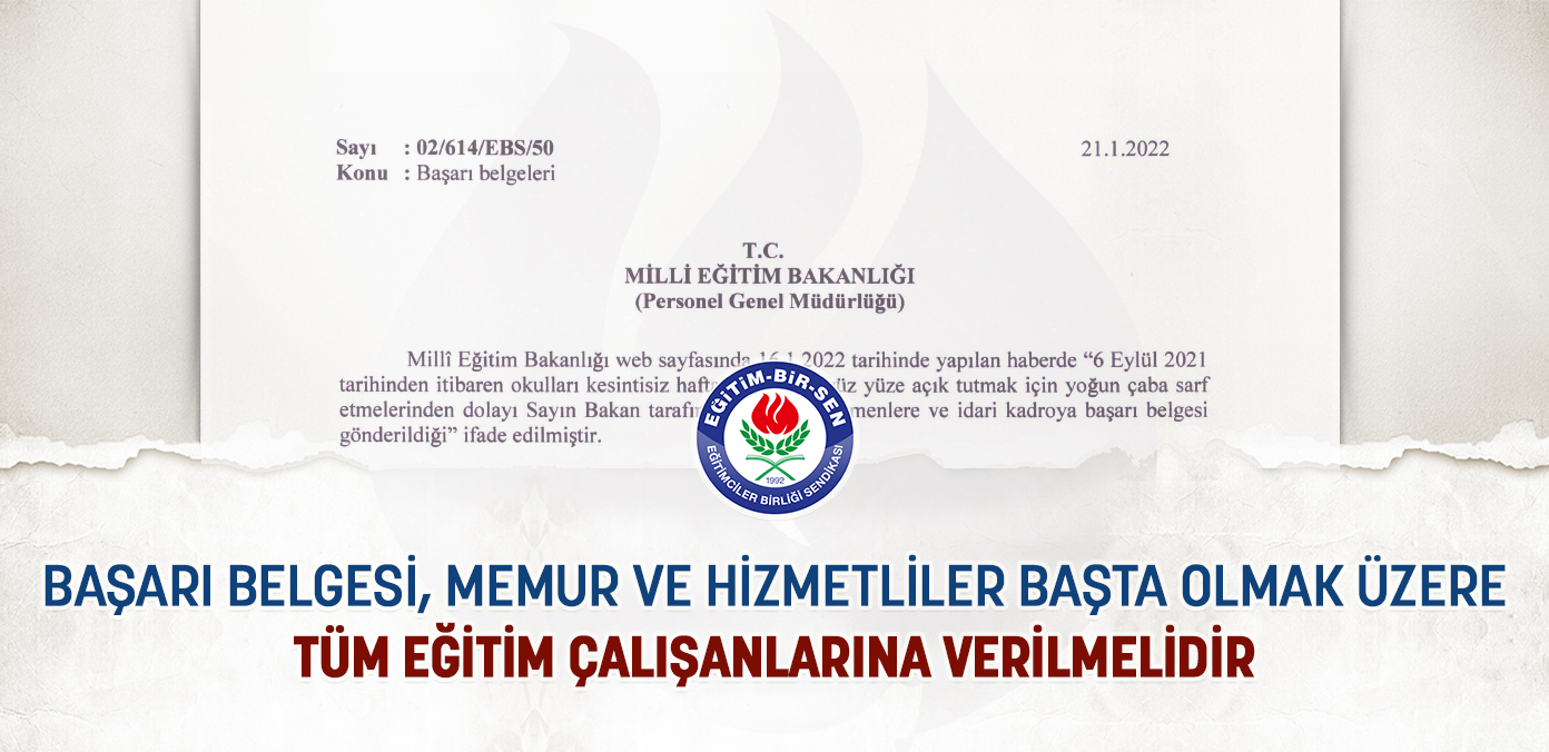 Eğitim-Bir-Sen olarak, Millî Eğitim Bakanlığı’na başvurarak, okullarda ve taşra teşkilatında görev yapan memur ve hizmetliler başta olmak üzere diğer hizmet sınıflarındaki personele ve bazı eğitim kurumlarında (öğretmenevleri, rehberlik ve araştırma merkezleri, il ve ilçe millî eğitim müdürlüklerinde) görevlendirilen öğretmen ve yöneticilere de başarı belgesi verilmesini talep ettik.