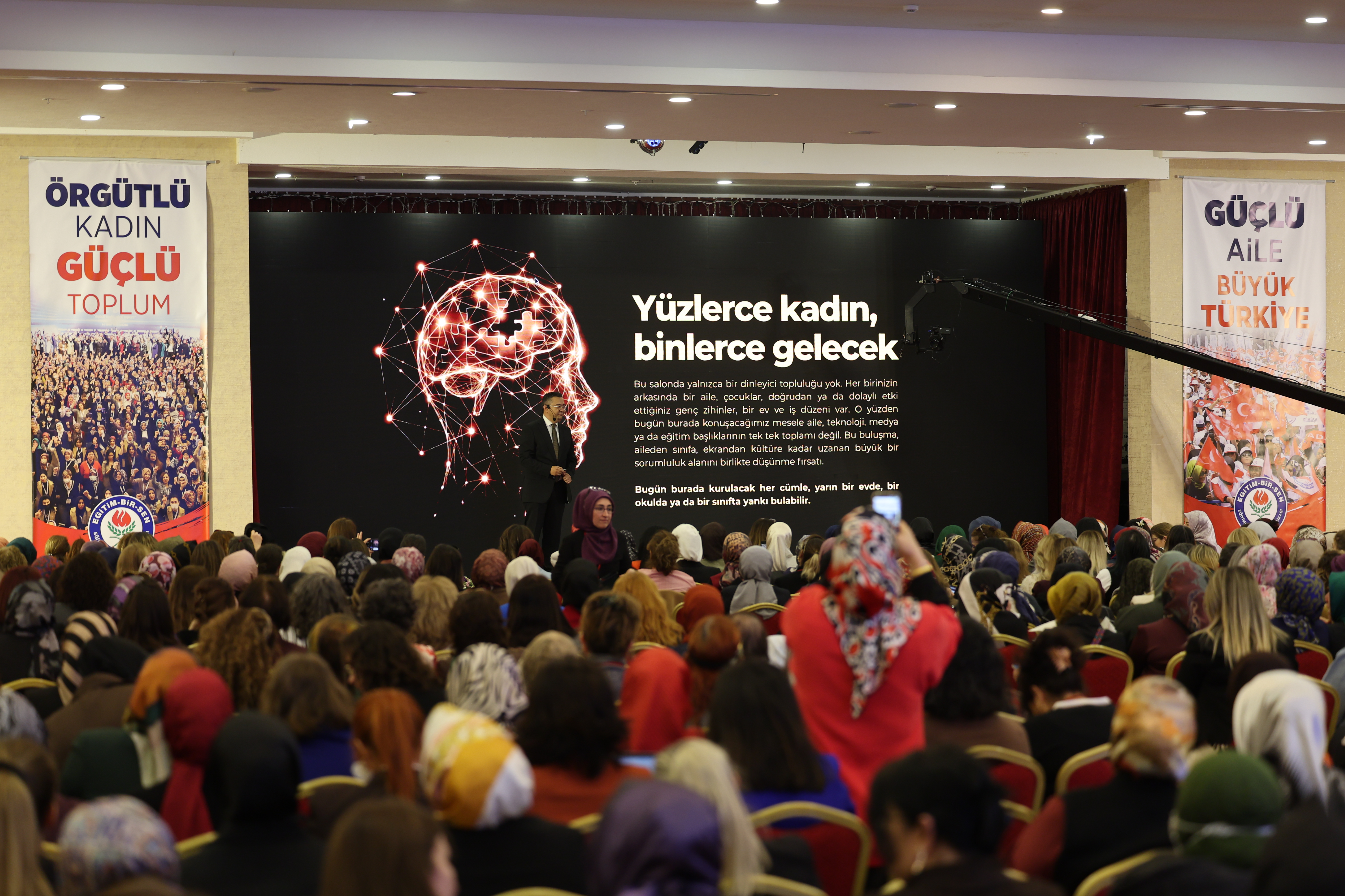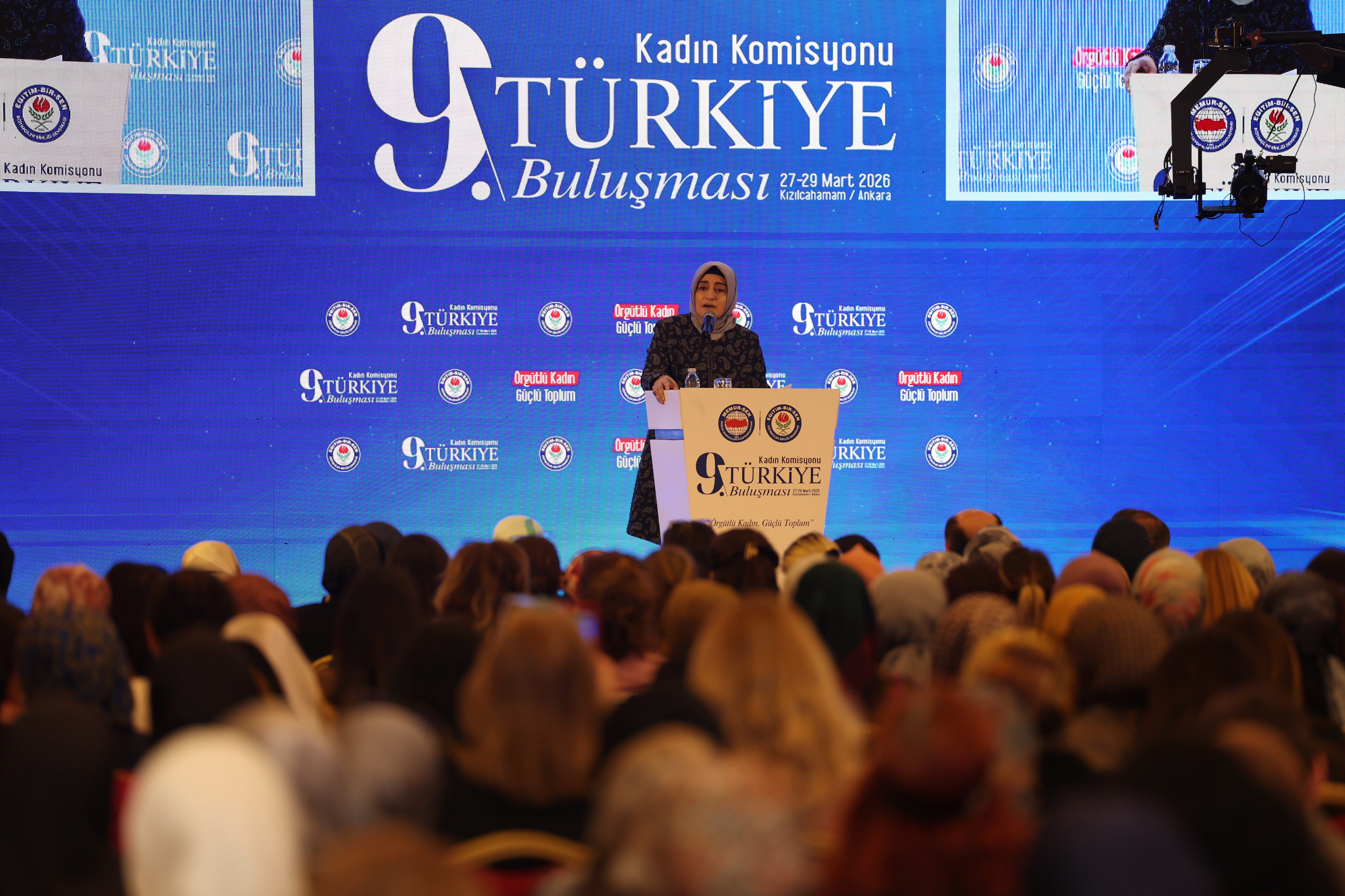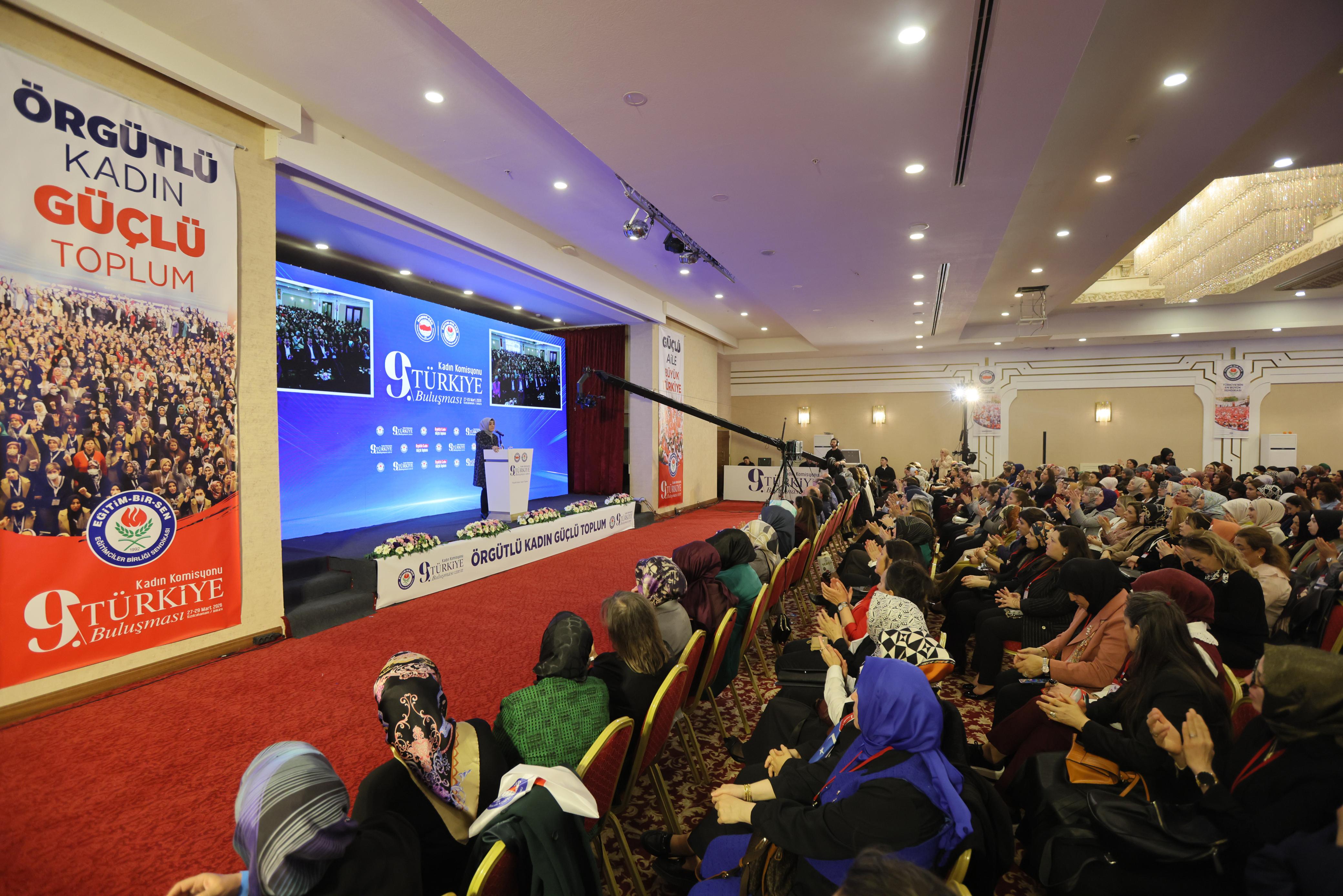“Ailesini, analık haklarını korumak isteyen kadın emekçinin sesi kısılıyor. Tek ebeveynli çocuk sayısı artarken, doğum oranları dramatik olarak düşüyor. Eğip bükmeye gerek yok; bugün dünyayı saran kapitalist emperyalist düzen nasıl barış üretmiyorsa, ‘kadın hakları ve özgürlükleri’ diye servis ettikleri süslü paket de insanlığı felakete sürüklüyor. Hiç kimse bu ifsada kayıtsız kalmamızı beklemesin. Ne sessiz kalırız ne de bize reçete diye sunulan zehre uzanırız. Çünkü biz meseleye bambaşka bir yerden bakıyoruz. Bizim anlayışımızda kadın güç savaşlarının aparatı, kültürel değişimin ajanı değil, toplumun vicdanı, medeniyetin taşıyıcısı, geleceğin kurucusudur. Kadınlar Komisyonumuz da sadece teşkilatımızın, sendikamızın bir parçası değil, inancımızın, kültürümüzün, değerlerimizin müstahkem kalesidir. İşte tam da bu anlayışla kadınıyla erkeğiyle Memur-Sen olarak bizler, küresel sistemin bu çürümüş bozuk düzenine karşı, ‘yükümüz bir, davamız bir, hedefimiz bir’ diyoruz.”