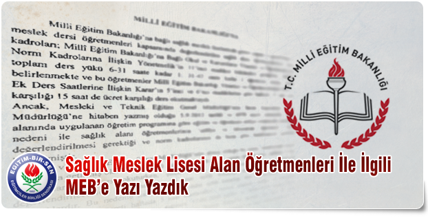 Mesleki ve Teknik Eğitim Genel Müdürlüğü’nün İnsan Kaynakları Genel Müdürlüğü’ne hitaben yazmış olduğu 5.9.2012 tarihli yazısında; eğitim ve öğretimin atölye ortamında yapılması nedeni ile sağlık alanı öğretmenlerinin ‘atölye ve laboratuar öğretmeni’ olarak değerlendirilmesi gerektiği ve norm kadrolarının da buna göre belirlenmesi için almış olduğu kararın doğuracağı mağduriyet ve sıkıntıları Milli Eğitim Bakanlığı’na bir yazıyla ilettik.