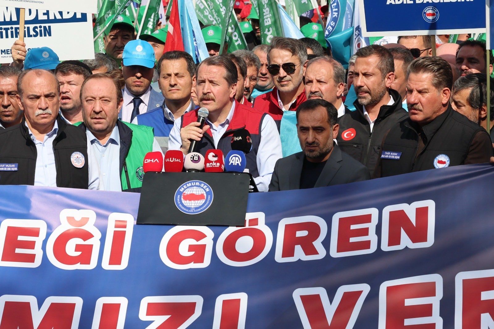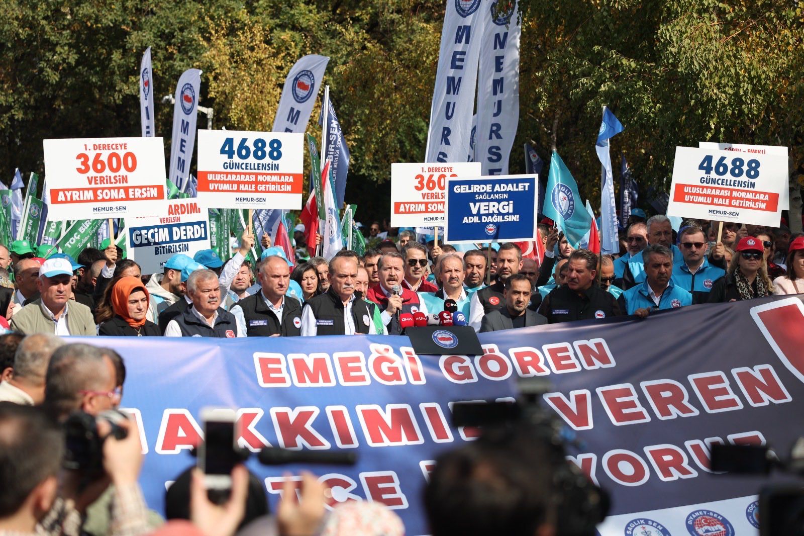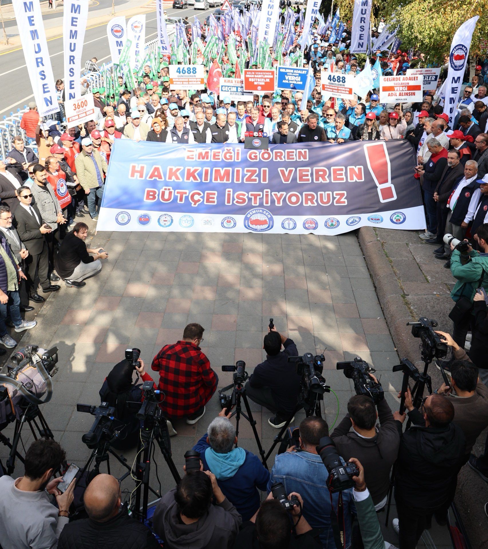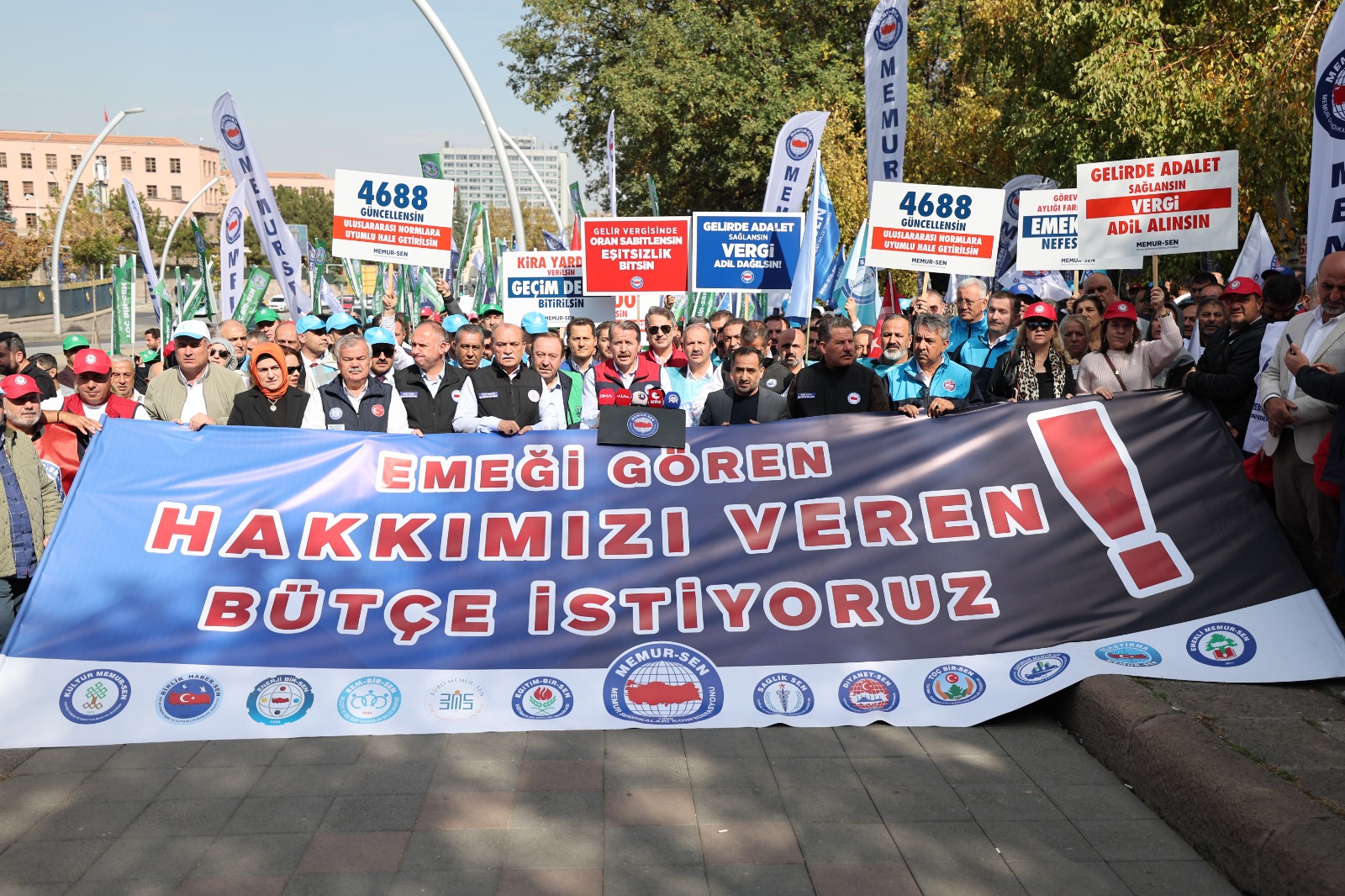 Memur-Sen ve Eğitim-Bir-Sen Genel Başkanı Ali Yalçın, Türkiye Büyük Millet Meclisi’nde görüşülecek olan Bütçe Kanunu öncesinde Memur-Sen’in düzenlediği eylemde “Emeği Gören Hakkımızı Veren Bütçe İstiyoruz!” yazılı pankartın önünde açıklama yaptı.