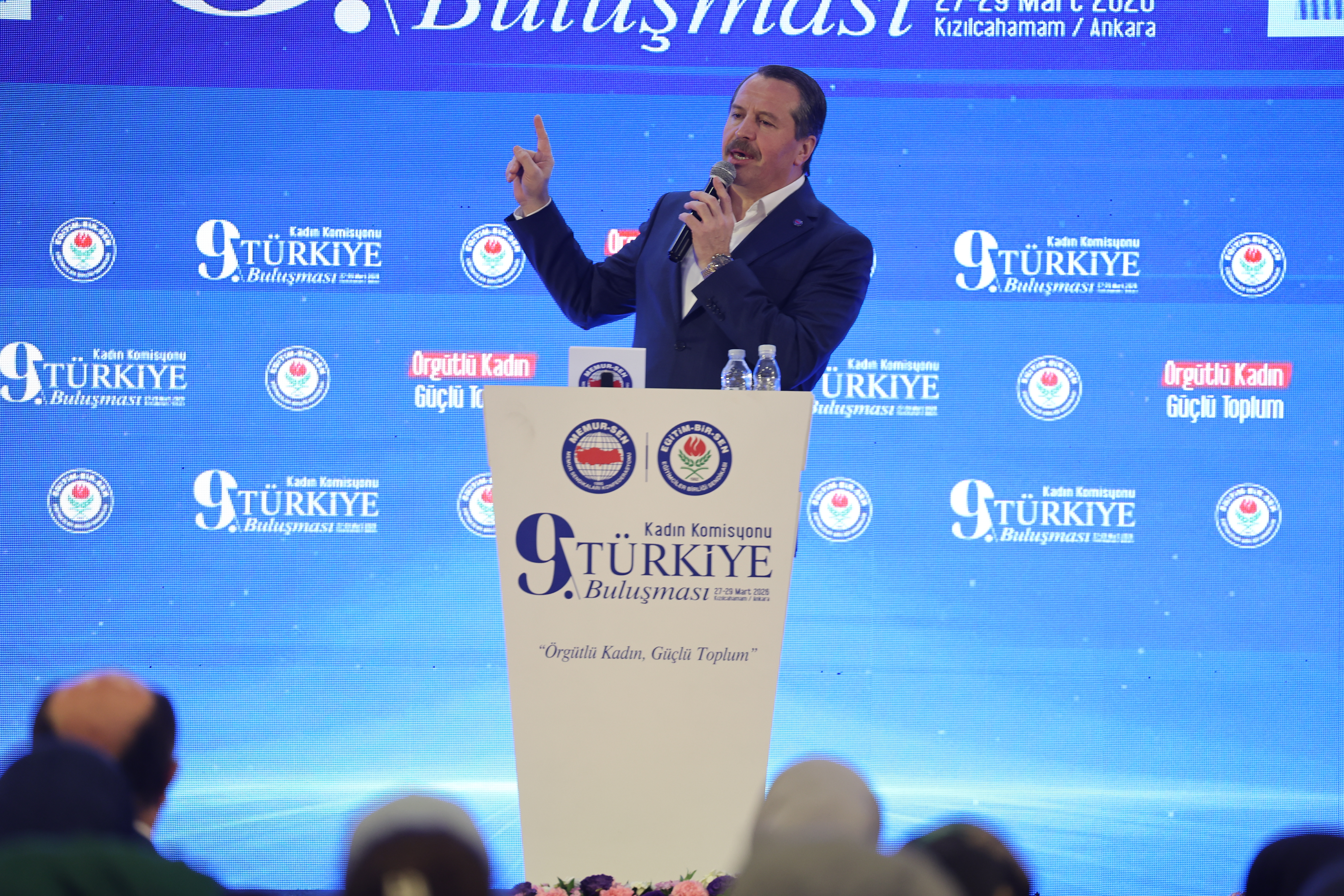 “Ailesini, analık haklarını korumak isteyen kadın emekçinin sesi kısılıyor. Tek ebeveynli çocuk sayısı artarken, doğum oranları dramatik olarak düşüyor. Eğip bükmeye gerek yok; bugün dünyayı saran kapitalist emperyalist düzen nasıl barış üretmiyorsa, ‘kadın hakları ve özgürlükleri’ diye servis ettikleri süslü paket de insanlığı felakete sürüklüyor. Hiç kimse bu ifsada kayıtsız kalmamızı beklemesin. Ne sessiz kalırız ne de bize reçete diye sunulan zehre uzanırız. Çünkü biz meseleye bambaşka bir yerden bakıyoruz. Bizim anlayışımızda kadın güç savaşlarının aparatı, kültürel değişimin ajanı değil, toplumun vicdanı, medeniyetin taşıyıcısı, geleceğin kurucusudur. Kadınlar Komisyonumuz da sadece teşkilatımızın, sendikamızın bir parçası değil, inancımızın, kültürümüzün, değerlerimizin müstahkem kalesidir. İşte tam da bu anlayışla kadınıyla erkeğiyle Memur-Sen olarak bizler, küresel sistemin bu çürümüş bozuk düzenine karşı, ‘yükümüz bir, davamız bir, hedefimiz bir’ diyoruz.”